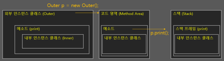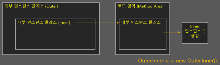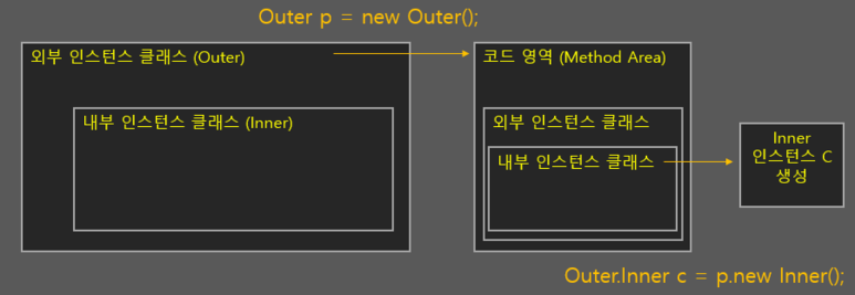 Outer.Inner c = p.new Inner(); // Outer.Inner 클래스 인스턴스 생성