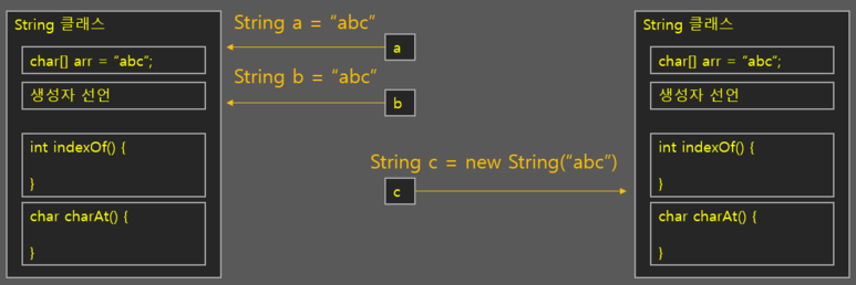 String a = "abc" 또는 String a = new String("abc") 형태로 String Class의 인스턴스를 하나 생성했다면 java.lang.String 클래스에 생성자를 문자열로 넣어주고 인스턴스를 생성했다는 의미입니다. 그래서 a.method()형태로 해당 클래스에 포함된 메소드를 사용할 수 있게 되는 것입니다.