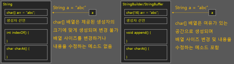 StringBuilder와 StringBuffer 클래스도 String 클래스와 같이 문자열을 다루는 클래스입니다. 다만, String 클래스가 문자열을 생성자로 넣어 인스턴스를 한 번 생성하고 나면 인스턴스가 가진 문자열 값을 변경하지 못하는 단점을 보완한 클래스입니다. 즉, 같은 인스턴스 안의 문자열(char 배열) 필드 값을 추가하거나 변경할 수 있도록 되어 있습니다. 또한 원본 문자열을 바꿀 수 있는만큼 문자열을 다루는 메소드도 더 많이 포함되어 있습니다.