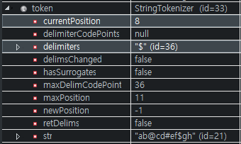 먼저 C언어의 strtok()함수와 마찬가지로, 두 번째로 제공된 구분자 문자열은 문자열 전체가 아닌 각각의 글자가 구분자가 됩니다. 만약 ("ab@cd#ef$", "@#$")로 사용했다면 "@","#","$" 문자가 각각 구분자가 됩니다. 그리고 boolean returnDelims 인자를 추가하지 않았다면 기본적으로 구분자는 나누어진 문자열에 포함되지 않습니다.