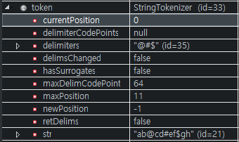 작동 방식을 알아보기 위해 디버깅을 해보겠습니다. 먼저 새로운 인스턴스를 생성하면 인스턴스에 생성자로 넘겨준 원본 문자열과 구분자 문자열이 그대로 저장됩니다. String 클래스의 split()메소드가 한번에 다 잘라서 배열로 반환해주는 것과는 달리, 일단 자르지 않고 그대로 저장해둡니다. 또한 원본 문자열 자체는 건드리지 않습니다.