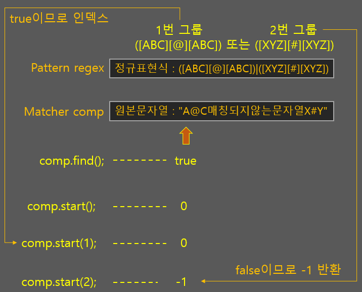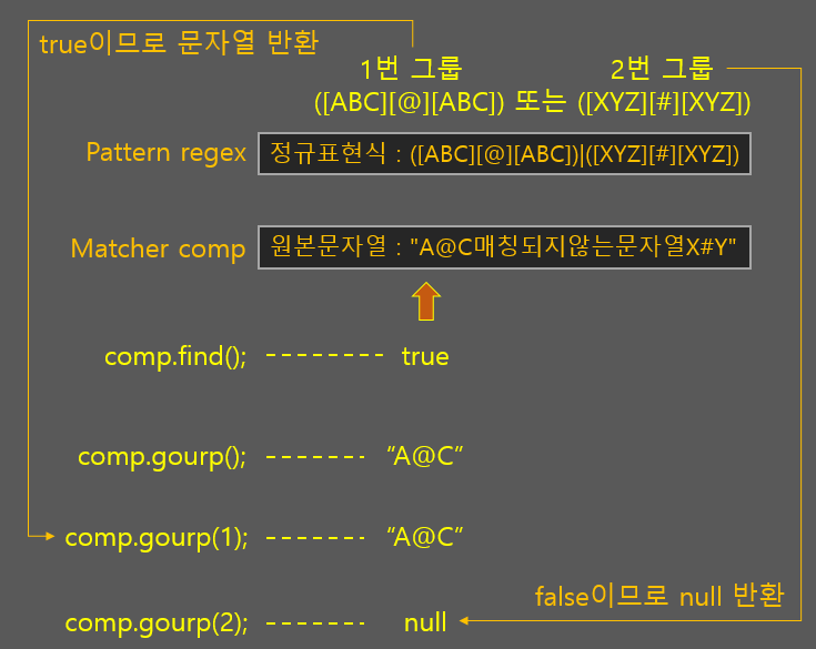 System.out.println(comp.group(2)); // null, 2번 그룹에 불일치하므로 null 반환