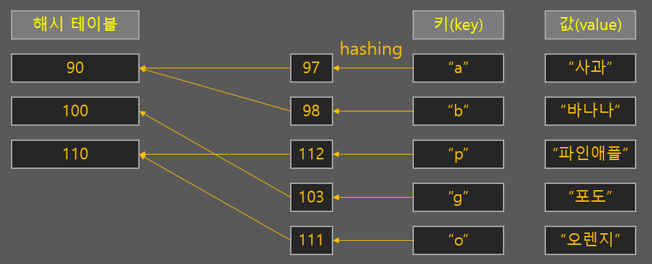 아래와 같이 키 값을 해싱하는 규칙이 아스키코드라고 가정해보겠습니다. 그럼 일단 해싱된 값을 가지고 해시 테이블에 지정된 카테고리에 저장을 합니다. 그럼 나중에 "a : 사과" 라는 값을 찾을 때는 배열처럼 순서대로 모두 검색하는 것이 아닌, 해시테이블의 90번 카테고리 안에서만 검색하면 됩니다. 무작위로 입력된 데이터들을 해싱 기법을 통해 분류해서 저장한 후 검색 시에도 이를 활용하는 것입니다.