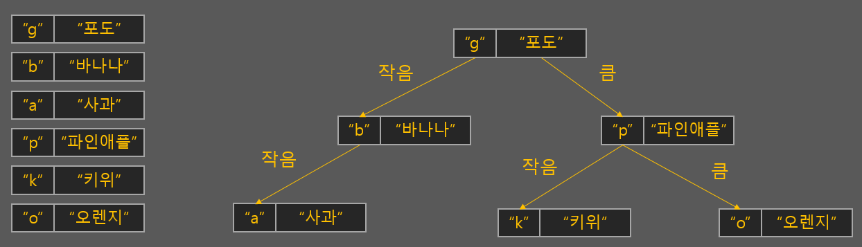 만약 "o : 오렌지"를 검색하게 되면 처음 "g : root"보다 크므로 오른쪽 노드로 가고, 다음 노드인 "p : 파인애플"보다 크므로 다시 오른쪽 노드로 가서 찾습니다. 6개의 데이터가 있지만 2번의 연산만으로 찾을 수가 있게 됩니다.