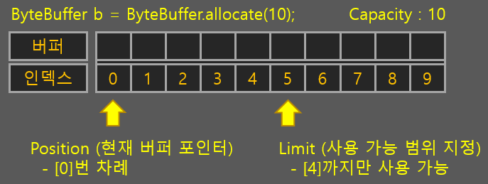 - Position : 현재 버퍼를 쓰거나 읽을 위치, 파일 포인터의 개념과 같은 버퍼 포인터라고 보면 됨