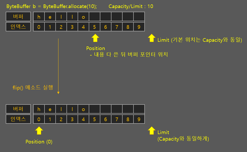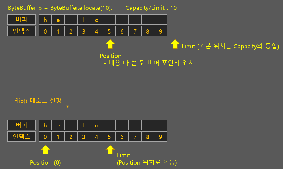 - 버퍼.flip() : 버퍼의 Limit을 현재 Position 위치로 이동시키고 Position 위치를 0으로 이동시킴