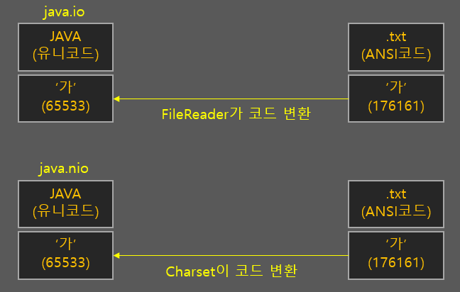실제로 바이트 스트림인 FileInputStream을 통해 .txt 파일의 내용을 읽어오면 문자 스트림인 FileReader로 읽어오는 코드와 전혀 다릅니다. 그래서 한글과 같은 다중 바이트 문자는 깨져서 나옵니다. 문자 스트림은 파일을 읽어올 때 내부적인 로직으로 ANSI코드를 유니코드로 변환해서 가져와 주기 때문에 문자를 제대로 읽을 수 있게 됩니다. NIO에서 이러한 문자 스트림 역할을 해주는 클래스가 java.nio.Charset 클래스입니다. 캐릭터셋이라고 부릅니다.