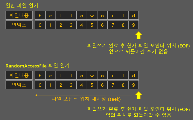 - RandomAccessFile 인스턴스.write(byte b) : 현재 파일 포인터 위치에 내용을 씀 (덮어씀)