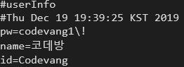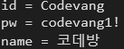 String[] str = { "id = Codevang", "pw = codevang1!", "name = 코데방" };