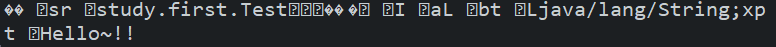 외부의 파일을 하나 생성해서 Output Stream을 열고 해당 클래스를 통해 직렬화를 수행해 객체의 정보를 모두 파일로 출력해줍니다. 직렬화와 역직렬화의 사용법 자체는 아주 간단합니다. 생성된 파일을 열어보면 알 수 없는 요상한 내용이 써져있습니다.