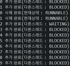 아래 예시 코드에서 보면 처음에 배열의 갯수가 0개이기 때문에 WAITING 상태가 되었다가 다른 스레드에서 notifyALL()을 해주자 살아나서 BLOCKED 상태로 대기하고 있습니다. BLOCKED은 대기 상태로, 하나의 객체를 여러 스레드가 사용하고 있어 한 스레드가 객체를 점유하고 있을 때는 다른 스레드가 점유할 수 없는 상태를 의미합니다.