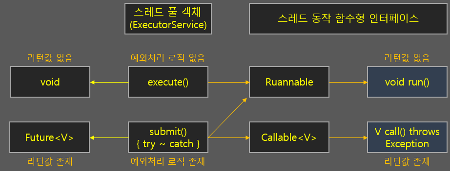 submit() 메소드의 경우 새로운 방식입니다. execute() 메소드와 다르게 스레드 동작 결과에 대한 반환값이 있습니다. 또한 스레드 동작 중 예외가 발생하더라도 스레드를 삭제하지 않고 다시 재사용해 스레드 삭제/생성에 따른 오버헤드를 줄일 수 있습니다. Runnable 객체를 사용하는 execute() 메소드는 예외 처리가 없기 때문에 예외 발생 시 스레드 자체가 종료되는 반면 Collable 객체를 사용하는 submit() 메소드는 예외처리 로직이 되어 있어 예외 발생 시에도 스레드를 종료시키지 않고 처리할 수 있기 때문입니다.