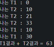 System.out.println("T1결과 + T2결과 = " + (arr[0] + arr[1]));