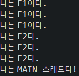 반복문으로 4번 과정을 처리하면 무한 루프가 돕니다. 예외 발생은 루프의 정상적인 탈출 과정이 아닙니다. 따라서 필요에 따라 break를 걸어주거나 또는 프로그램 내내 실행되도록 별도의 스레드를 써서 실행해주면 됩니다. 예시 코드는 아래와 같습니다. 반복문 횟수를 적게 돌린 2번 스레드의 결과를 먼저 얻은 것을 알 수 있습니다.