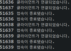 이제 실행 결과를 확인해보겠습니다. 먼저 서버쪽을 먼저 실행해보면 클라이언트 연결 요청이 없어서 그냥 아무것도 뜨지 않고 응답 상태로 기다리고 있습니다.