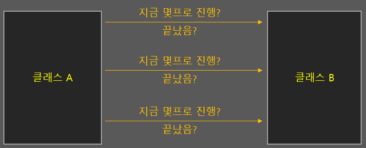 이 문제를 해결하기 위해 두 가지 방법이 있습니다. 하나는 클래스A(스레드1)에서 클래스B(스레드2)의 파일 전송 상태를 지속적으로 체크하는 것입니다. B의 상태값을 계속 저장하고, A는 그 상태를 계속 확인하다가 40%, 80%, 종료가 될 때마다 해당 알림을 출력해주면 됩니다. 이렇게 한 스레드가 다른 스레드의 상태를 지속적으로 확인하는 것을 동기적 방식이라고 합니다.