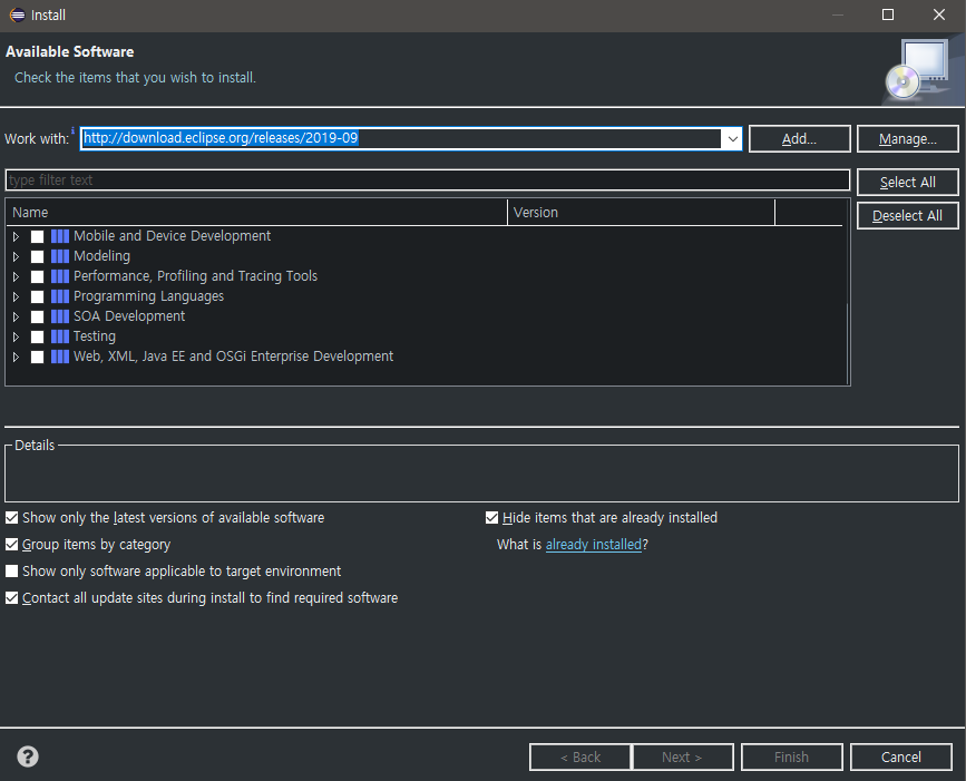 2. Work with란에 "http://download.eclipse.org/releases/본인버전" 을 입력하고 엔터