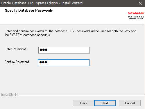 9. Next 누르다가 system(관리자) 계정 비밀번호 입력하고 Next 및 Install 클릭