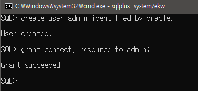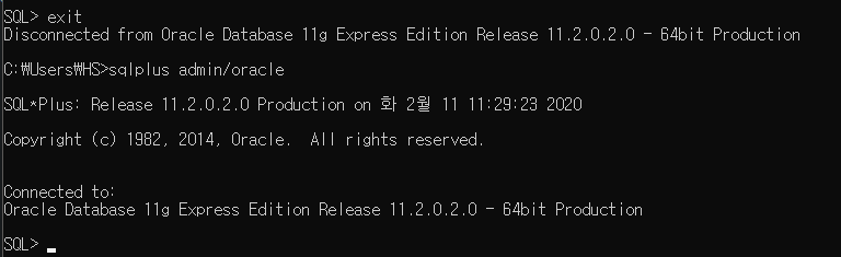 14. "exit" 명령으로 sqlplus 종료 후 새로 만든 계정으로 재로그인해서 확인 (테스트 완료)