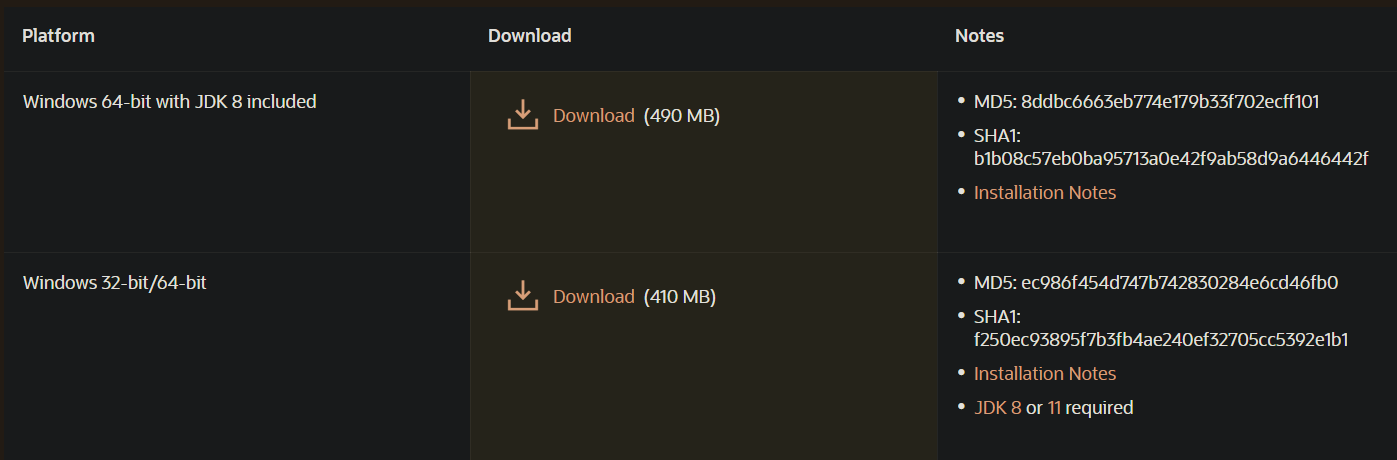 - 현재 JDK 9버전 이상이라면 첫 번째 버전(with JDK 8 included) 다운로드