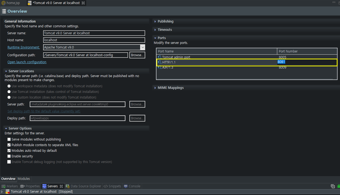 10. 오라클 DB에서 8080 포트를 점유하기 때문에 이클립스에서 Tomcat 서버의 서비스 포트를 바꿔줌