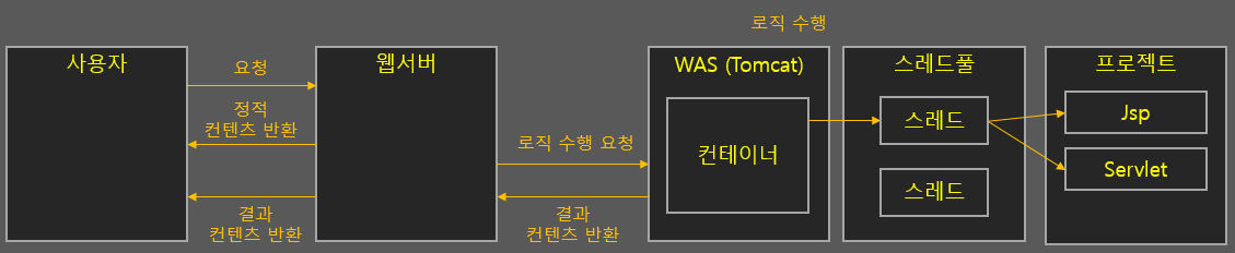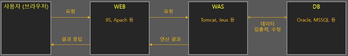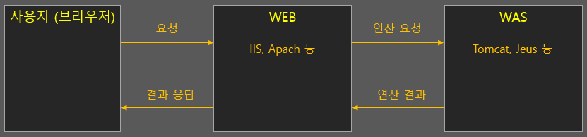 - WEB 서버는 요청 객체(request)를 받아서 바로 처리하거나 어플리케이션 서버(WAS)로 객체 전달