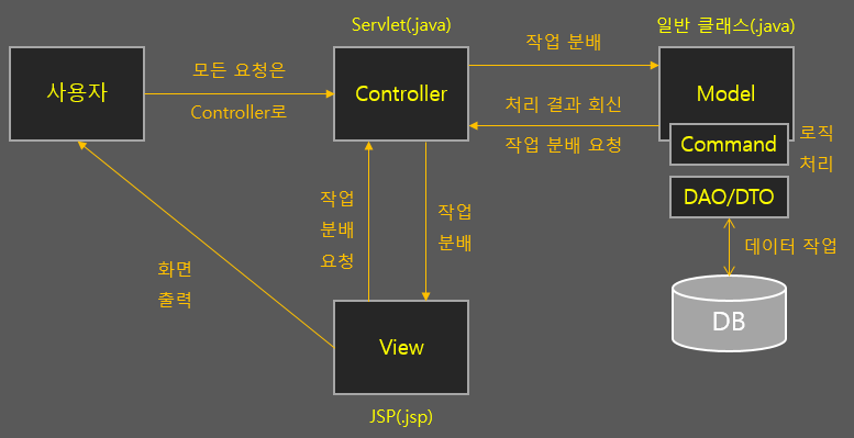 실제 로직을 수행하는 역할을 하는 자바 클래스입니다. Command는 로직을 수행하는 기능을 가진 클래스를 의미하고 DAO/DTO는 DB와 연동되어 데이터 작업을 담당하는 기능의 클래스입니다. 둘을 나눠둔 것도 역시 기능별로 모듈화를 하는 객체지향적 방식을 지향하기 때문입니다. DAO는 데이터 작업 로직을 가진 클래스이고 DTO는 데이터를 저장해 운반하기 위한 클래스입니다. 일반적인 자바 프로그래밍과 동일한 구조입니다.