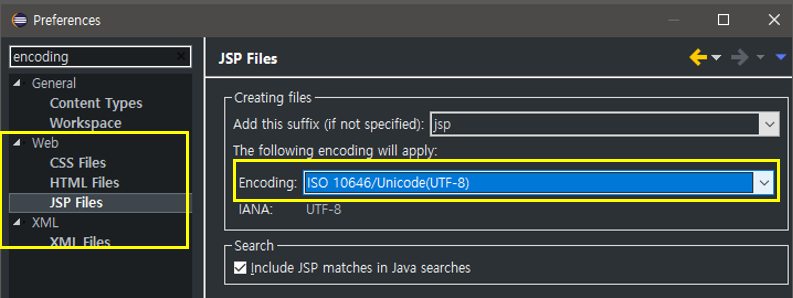 3. 다른 형식(JSP 등)의 기본 인코딩 타입을 변경하고 싶다면 아래쪽 탭의 설정들도 바꿔줌