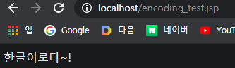 아래와 같이 JSP에서 <meta> 태그의 인코딩 타입을 아무거나 넣고 가동해도 정상적으로 브라우저에서 한글이 출력되는 것을 확인할 수 있습니다. 헤더의 contentType으로 인코딩 타입이 명시되어 있기 때문에 무시하는 것입니다.
