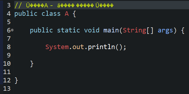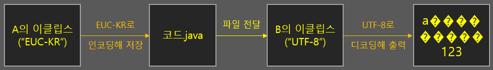 만약 지금 이클립스의 java 파일 인코딩 방식이 "EUC-KR"일 때 파일을 하나 저장한 뒤, 다시 인코딩 방식을 "UTF-8"로 변경하고 해당 파일을 읽어오면 공통 코드인 숫자나 영문은 멀쩡하지만 한글은 모두 깨져서 나옵니다. 따라서 A라는 사람이 이클립스 환경설정을 "EUC-KR" 인코딩 타입으로 지정해서 저장한 뒤 B에게 보내줬는데 B의 이클립스의 인코딩 타입이 "UTF-8"이라면 아래와 같이 한글 또는 다른 언어의 문자가 깨져서 보이는 현상이 발생하게 됩니다.
