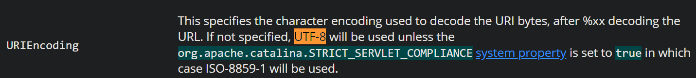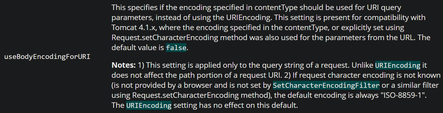 예전 버전의 톰캣은 URI의 디폴트 인코딩 방식도 "ISO-8859-1"인걸로 아는데 제가 사용하는 Tomcat 9.0에서는 이상하게 한글이 깨지지 않고 잘 작동해서 Tomcat docs에서 찾아보니 9.0 버전에서는 URI의 디폴트 인코딩이 "UTF-8"로 되어 있었습니다. 같은 시스템이라도 버전 마다 디폴트 방식이 다르니 개발/운영 환경 등을 구성할 때 주의해야 합니다.