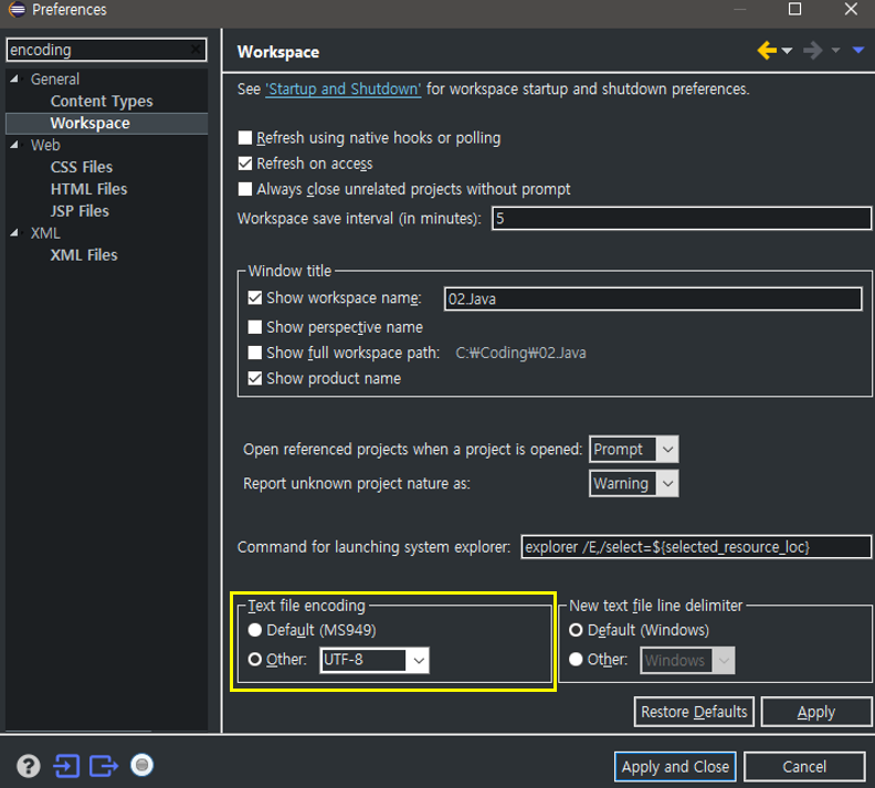 1. "windows - Prferences" 탭에 들어가서 "encoding"으로 검색