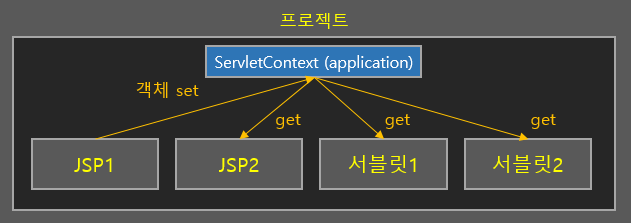 ServletContext 객체는 어플리케이션(프로젝트 단위)이 딱 하나만 가지고 있는 객체입니다. 컨테이너에서 프로젝트를 구동시킬 때 프로젝트 단위로 딱 하나씩 만들어서 줍니다. 따라서 이 객체는 프로젝트 단위 내의 모든 JSP와 서블릿에서 공유되는 객체입니다.