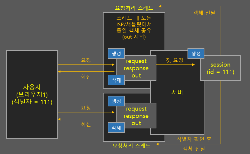 - 하나의 브라우저에 대응하는 로직에서 JSP/서블릿끼리 정보를 주고받을 떄는 Session 객체에 실어서 주고 받으면 됩니다. 대표적으로 로그인 인증에 대한 정보가 있습니다.