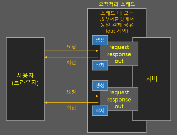 이 객체들의 이해는 쉬우니 간단히 넘어가겠습니다. 브라우저에서 서버로 요청을 하고 서버에서 브라우저로 회신해주고 나면 이 객체들은 모두 사라집니다. Request, Response 객체는 하나의 요청을 처리하는 스레드에서 모든 JSP와 서블릿이 공유합니다. out은 서블릿에 공유되지 않기 때문에 서블릿에서 바로 클라이언트로 출력해주기 위해서는 PrintWriter의 출력 스트림을 따로 생성해줘야 합니다.