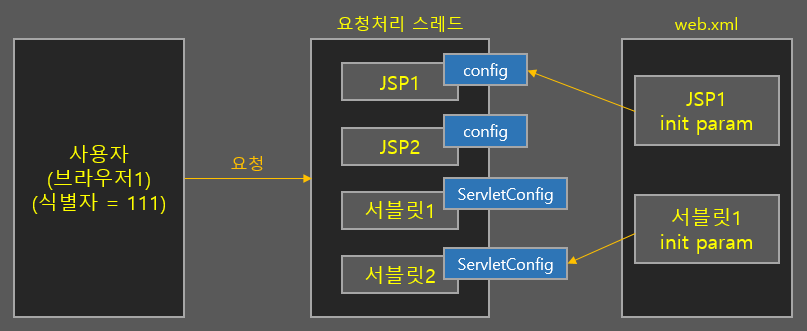 ServletConfig 객체는 web.xml 파일에서 특정 JSP/서블릿에 초기화 파라미터를 매핑시켜둔 값을 가지고 있는 객체입니다. JSP/서블릿이 메모리에 로드되는 시점에 실제 생성되는 객체인데, 동일 JSP/서블릿은 딱 하나의 ServletConfig 객체를 가집니다. 따라서 따로 다른 클래스나 JSP에 객체 또는 값을 전달하지 않는 한 해당 객체는 지정된 JSP/서블릿에서만 사용할 수 있는 딱 하나의 객체입니다. 같은 요청을 처리하는 동일 스레드에서도 다른 클래스나 JSP끼리 자동으로 공유되고 그러지 않습니다. 각자 하나씩 가지고 있습니다.