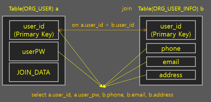 select a.user_id, a.user_pw, b.phone, b.email, b.address from org_user a