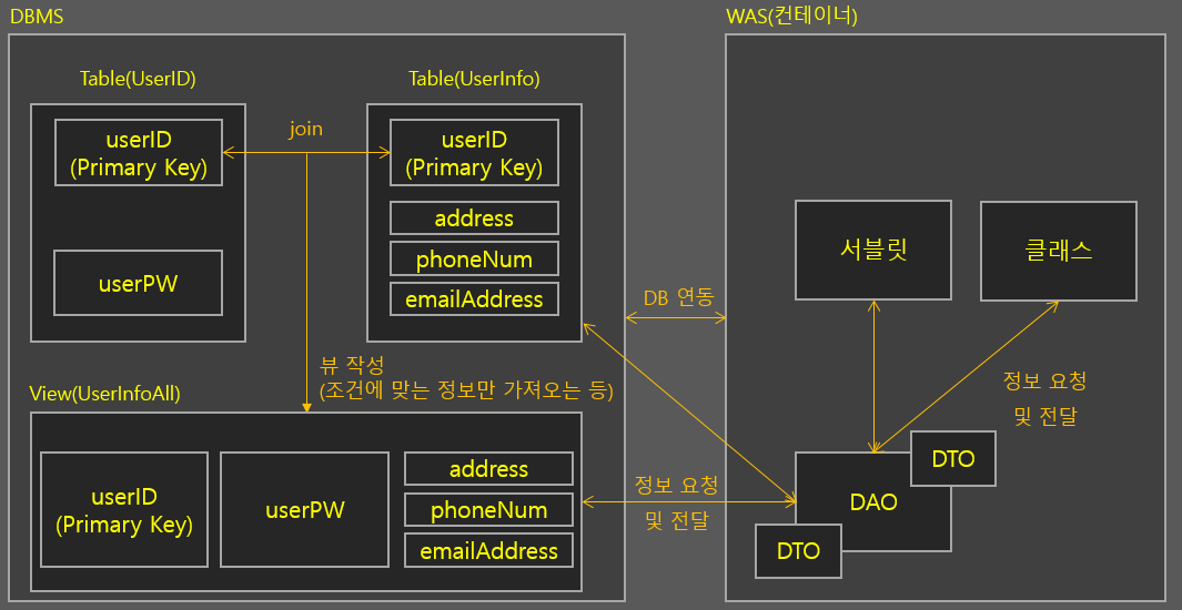 쪼개진 테이블들의 내용은 나중에 WAS에서 쉽게 가져갈 수 있도록 하기 위해 뷰(View)라는 것을 따로 작성해두는데 뷰는 여러 테이블의 내용을 입맛대로 엮어서(join) 하나의 가상 조회용 테이블을 만드는 방식입니다. 뷰는 호출될 때마다 새로 만들어지기 때문에 테이블의 내용이 수정되면 뷰의 내용도 같이 바뀝니다. 여러 테이블에서 값을 엮으려면 유니크한 값이 필요한데 이를 'Primary Key'라고 합니다. 이 키값을 기반으로 두 테이블의 값을 조합할 수 있습니다. 뷰를 사용해서 데이터를 유연하게 다룰 수 있고 또 조회 시 프로그램에서 테이블에 직접 접속하지 않도록 하므로써 보안이나 안정성을 높일 수 있습니다.