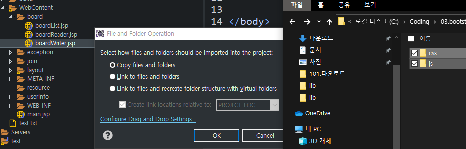 다운받은 압축파일을 풀어보면 css와 js 두 폴더가 나오는데, 프로젝트의 WebContents 폴더 아래 신규 폴더를 하나 생성한 뒤 거기에 복사해줍니다. 그냥 탐색기에서 마우스로 잡아서 끌어놓으면 아래와 같은 메세지가 뜨는데 OK를 눌러주면 됩니다.