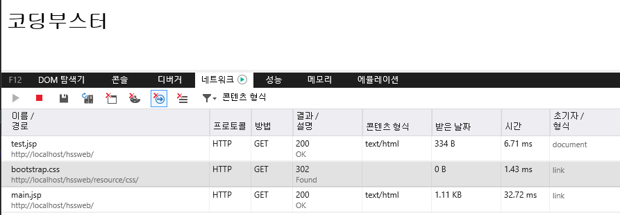 부트스트랩을 셋팅하고 사용을 해봤는데 CSS 스타일이 적용되지 않고 있습니다. 뭐가 문젠지 보기 위해 익스플로러를 켜봅니다. F12를 눌러서 네트워크탭을 킨 뒤 새로고침을 한 번 하면 오고가는 페이지의 정보를 볼 수 있습니다.