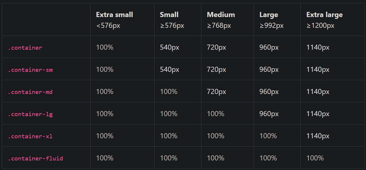 컨테이너는 태그 안에 들어가는 내용물의 가로길이를 제한해주는 박스의 개념입니다. 부트스트랩에서 정해놓은 스타일은 아래와 같습니다. 브라우저의 가로 길이에 따라 반응해 크기를 늘리고 줄여줍니다. container-fluid의 경우는 어떤 크기던 간에 꽉 채워서 보여줍니다.
