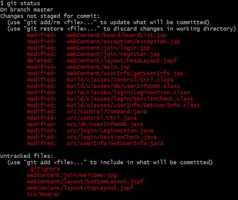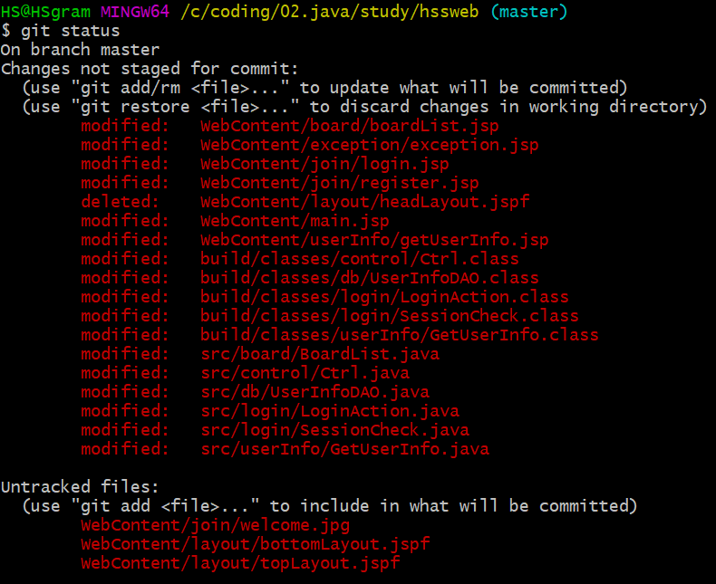 마지막 커밋 시점을 기준으로 수정(modified)된 파일들과, 새로 만들어진 파일(untracked)들의 목록이 보여집니다.