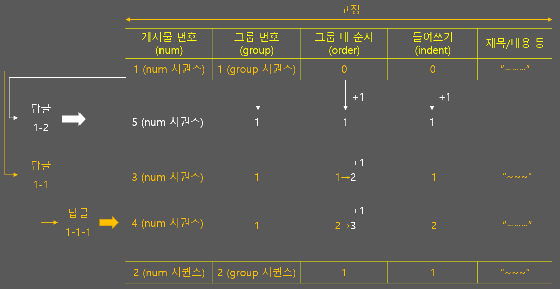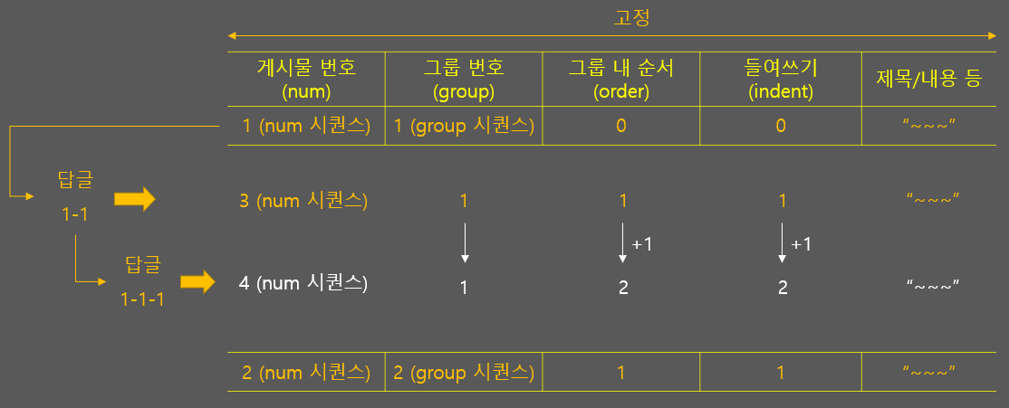 - 그룹 내 순서 : 부모 게시물의 ('그룹 내 순서' + 1)
