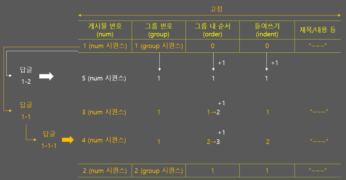 또한 로직 설계 글에서 다뤘듯이, 답글 작성의 경우 해당 그룹에서 새로운 답글의 순서와 같거나 큰 게시물들의 순서를 1씩 증가시켜줘야 합니다.
