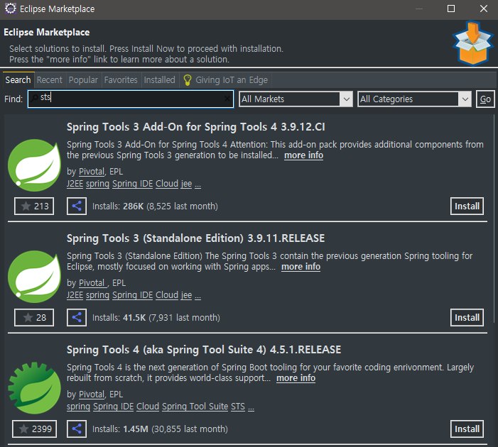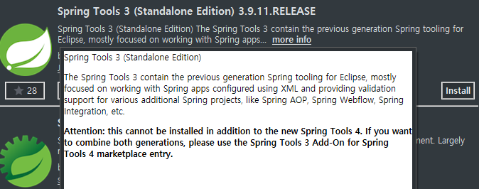 - "Spring Tools 4"는 스프링 부트만 설치 된다고 설명에 적혀있음