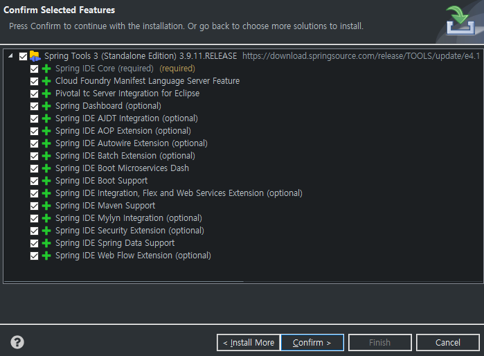 - "Spring Tools 3 Add-On"은 스프링 부트(4)가 설치돼 있을 때 스프링(3)의 컴포넌트를 추가하는 용도라고 돼있음