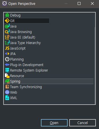 8. 우측 상단 Perspective에 스프링이 없다면 추가