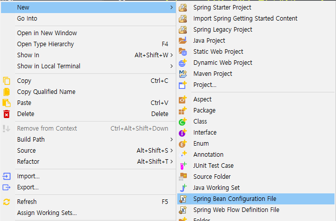 파일은 개발자가 임의로 만들면 됩니다. 위치는 "/src/main/resouces" 폴더가 기본 루트(/) 폴더이며, 하위 폴더를 따로 생성해서 그안에 넣어줘도 무방합니다. 나중에 해당 위치를 제대로 찍어주기만 하면 됩니다. 일단 저는 루트 폴더 위치에 하나 생성했습니다. 이클립스에서 "Spring Bean Configuration File"로 생성해주면 필요한 부분들을 자동으로 셋팅해 만들어줍니다.