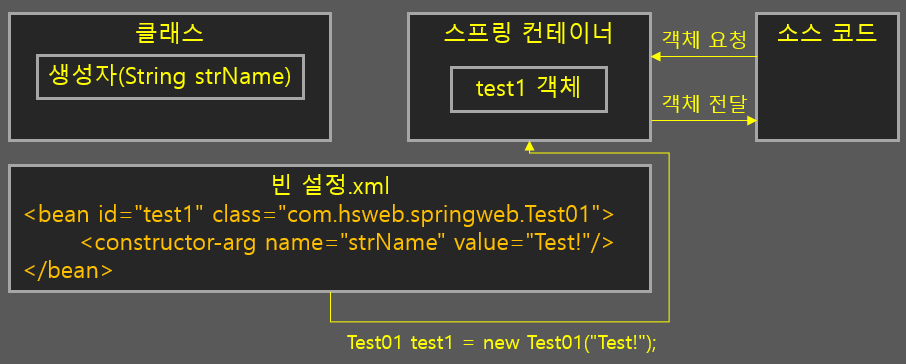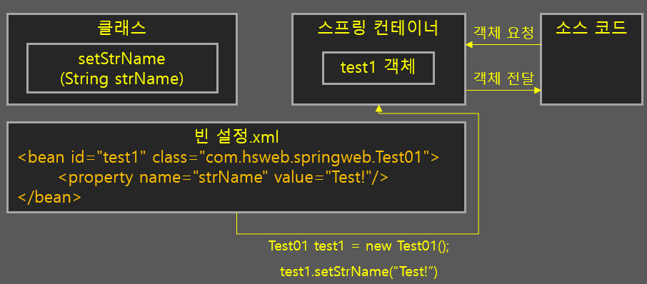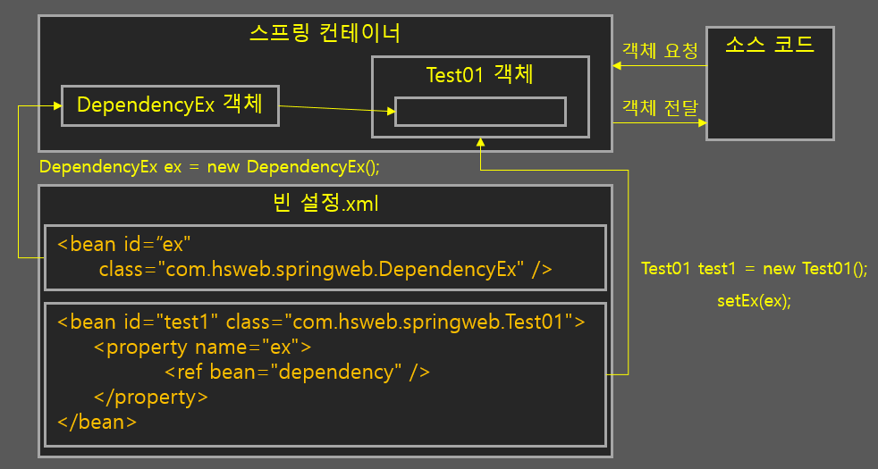 이제 개발자가 코드에서 "Test01" 클래스의 객체만 컨테이너에서 가져오면 "DependencyEx" 클래스의 객체는 자동으로 주입되게 됩니다.