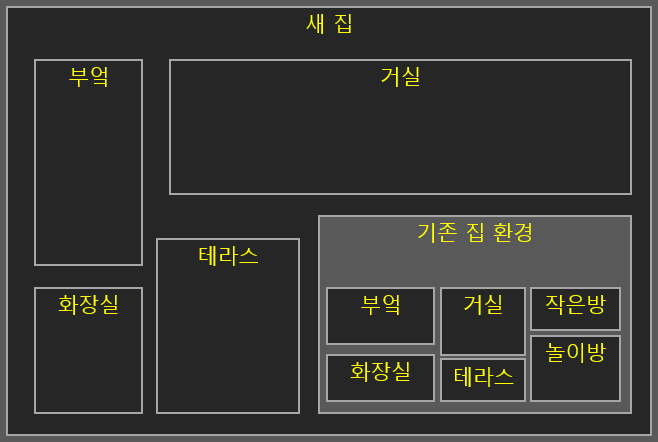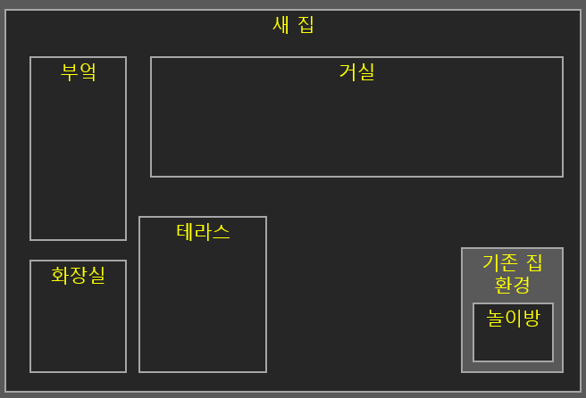 하지만 사실 애기한테 필요한 곳은 놀이방입니다. 부엌이나 거실, 테라스 등은 부모님한테나 필요하지 애기는 별로 신경을 안씁니다. 필요하면 나가서 사용하면 되죠. 이 경우 위와 같이 아예 집을 통째로 구현해버리는 것은 매우 낭비가 됩니다. 그래서 이번에는 놀이방만 기존 집의 환경과 동일하게 셋팅해줬습니다. 애기는 같은 놀이방을 가지게 되어 울지 않고 부모님은 본인들의 공간이 넓어진데다가 놀이방을 만들고 유지하는 노력도 훨씬 덜하게 되어 좋아합니다. 이제 이사를 자주 가도 별로 부담이 없게 됐습니다.